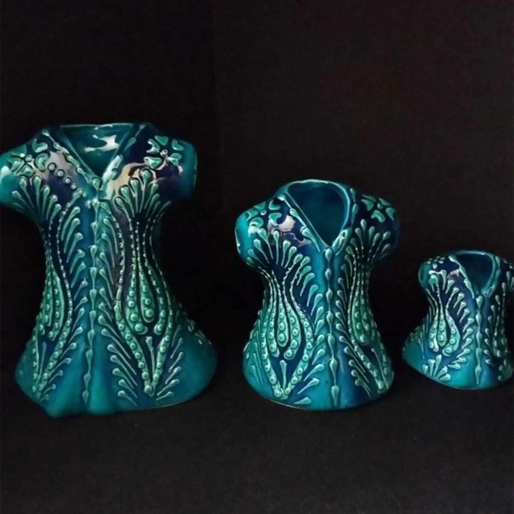 Üç parçadan oluşan bu set, farklı boyutlarda ve tasarımlarda seramik kaftanları içerir